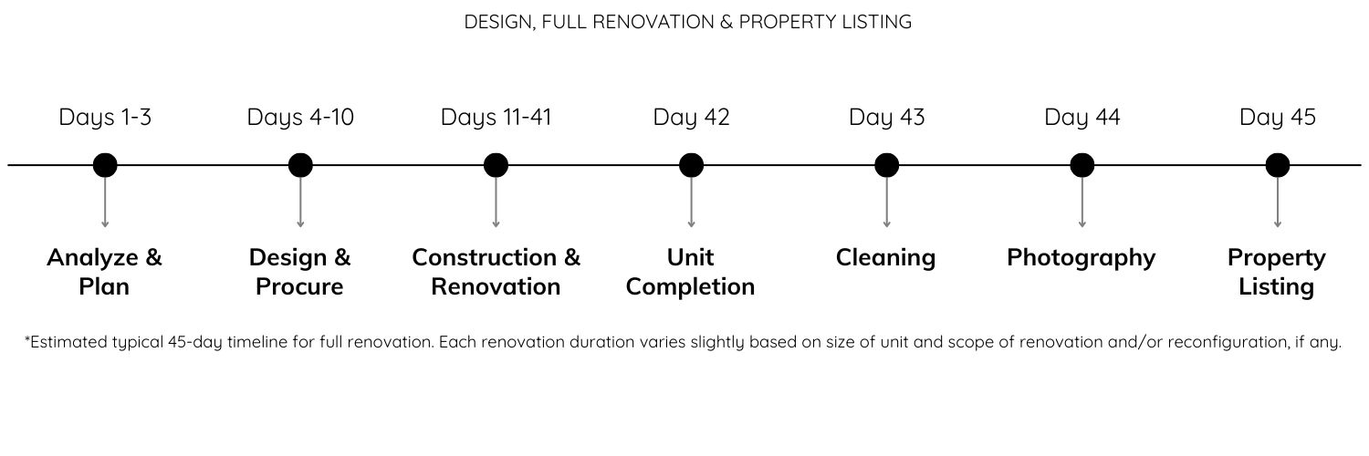 Design and renovation of each property includes the selection, procurement and install of all furniture, fixtures and equipment (FF&E) and operating supplies and equipment (OS&E) to deliver a 100% turn-key ready-for-guests vacation rental.